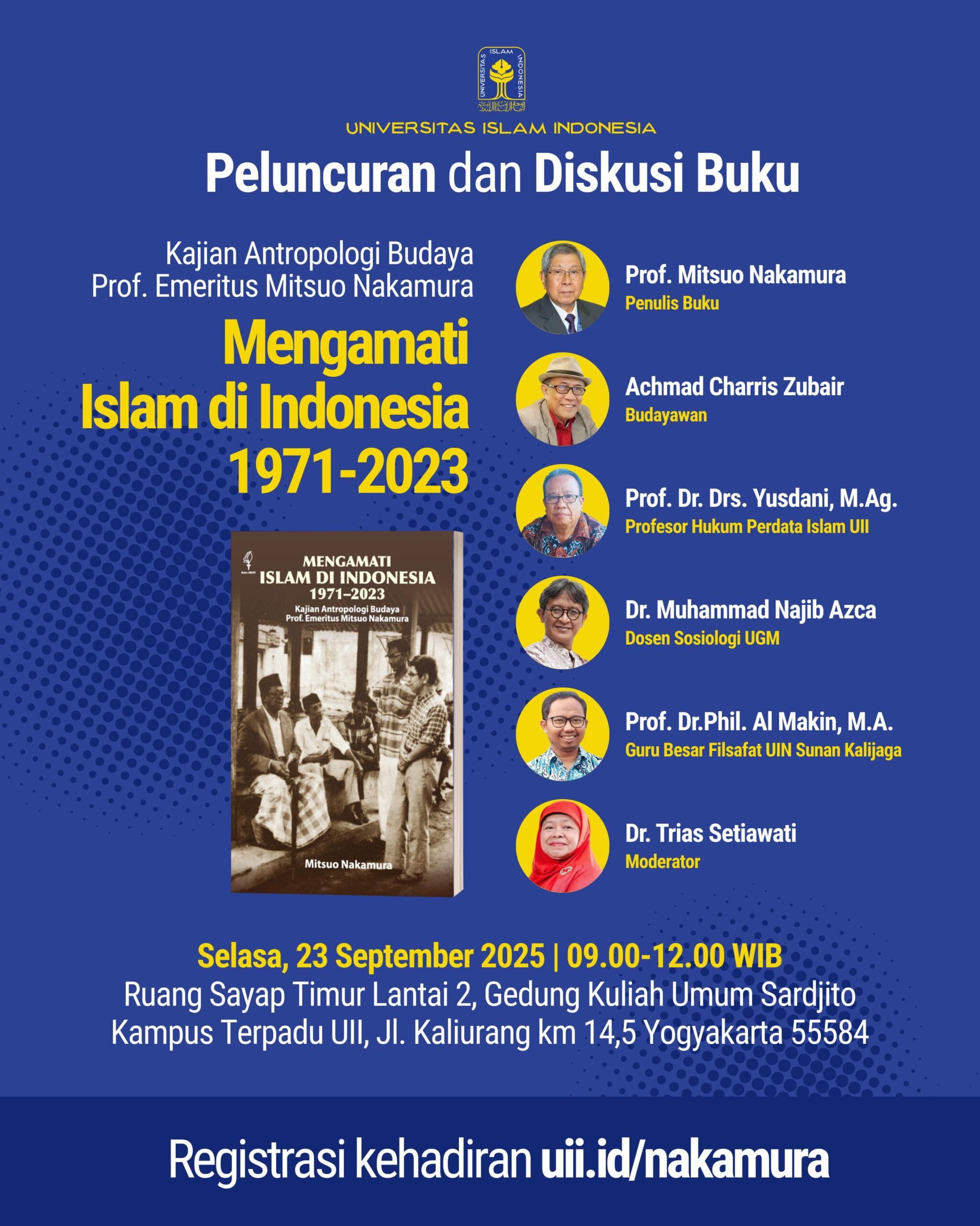 - Meta deskripsi: Bergabung dalam peluncuran dan diskusi buku Mengamati Islam di Indonesia 1971–2023 karya Prof. Emeritus Mitsuo Nakamura. Diskusi multidisipliner bersama akademisi dan budayawan. Selasa, 23 Sept 2025 — registrasi di uii.id/nakamura.